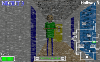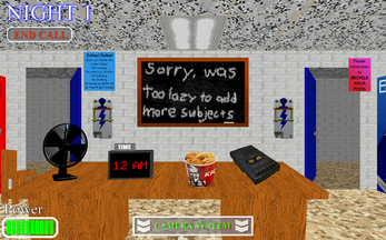 The camera system can be used to monitor the movements of Baldi and his friends, but be careful. You can also use the doors in your office to ward off their attacks, but closed doors drain power faster and you only have a limited amount to last through the night with.